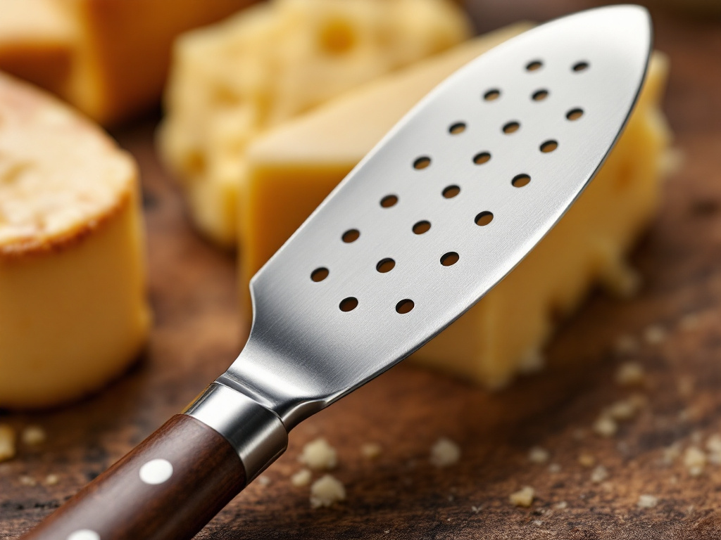 A close-up of a cheese knife with a wide blade and holes, designed for easy slicing of various cheeses.