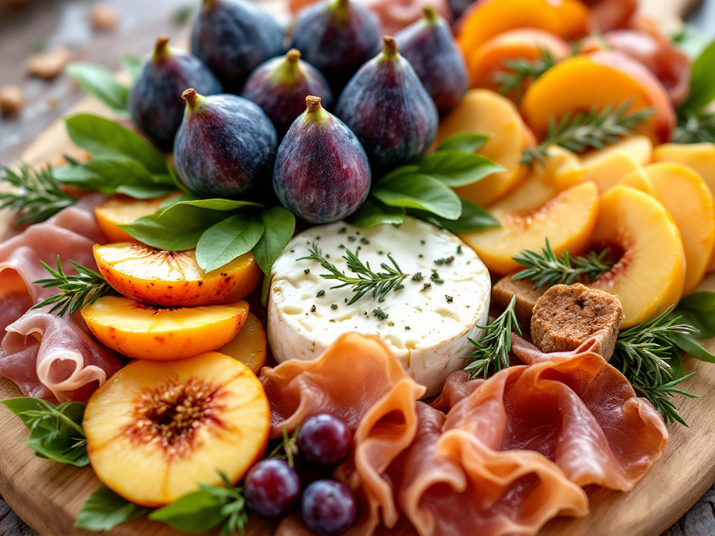 A charcuterie board with seasonal fruits like figs and peaches, paired with a variety of cheeses.
